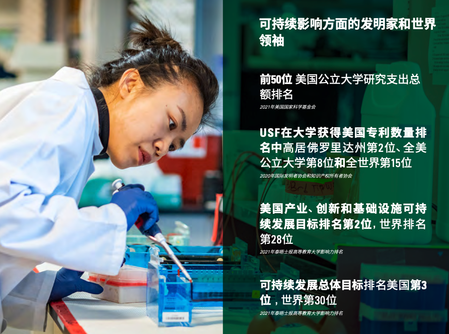 USF是过去十年中排名上升最快的美国大学,现全美公立Top 50(US News 2022),THE全美最佳公立大学#29,QS全美排名#78,年均5.6亿+美金科研经费,以高专利授权率闻名。